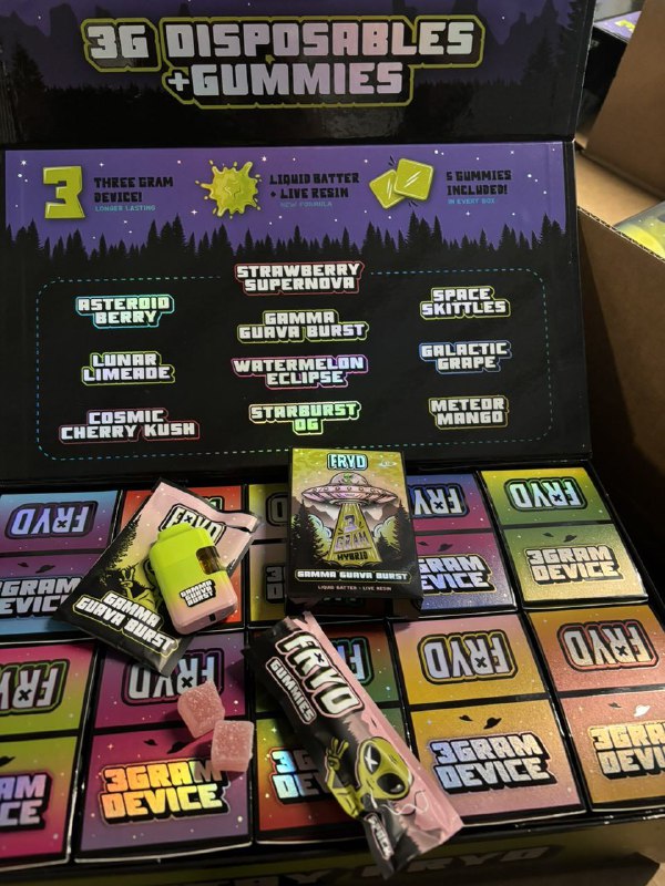 | FLAVORS | Asteroid Berry, Lunar Limeade, Cosmic cherry kush, strawberry supernova, Gamma guava burst, watermelon eclipse, starburst OG, Space skittles, galactic grape, Meteor mango |